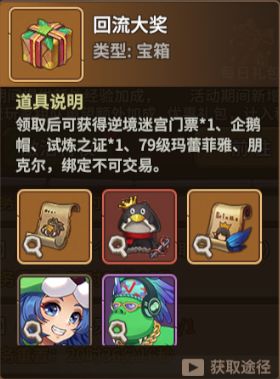 回流玩家完成7次每日累计任务后,还能领取回流大奖,内含朋克尔*1,79级玛蕾菲雅*1,试炼之证*1,企鹅帽*1,逆境迷宫门票*1,奖励超级丰厚!