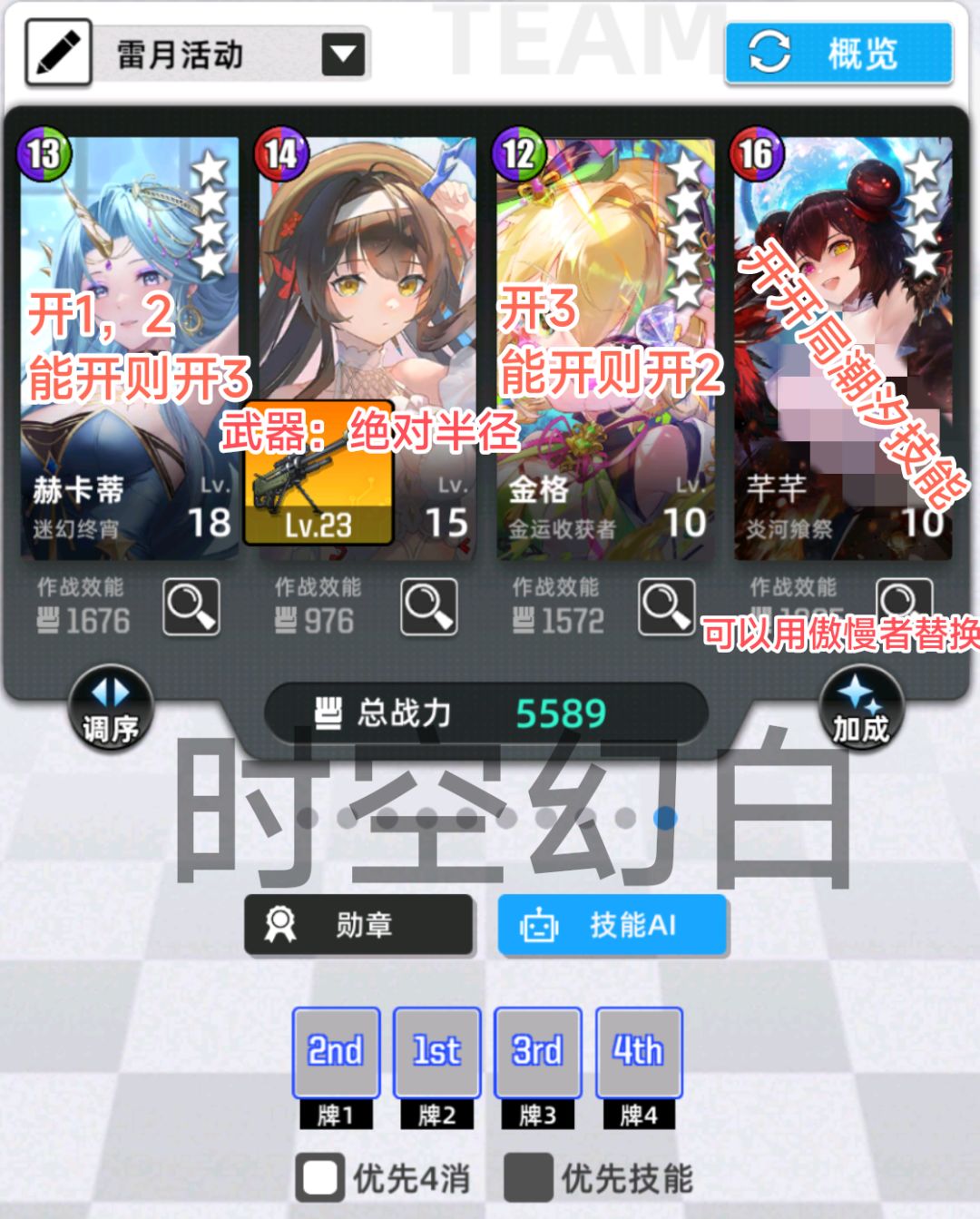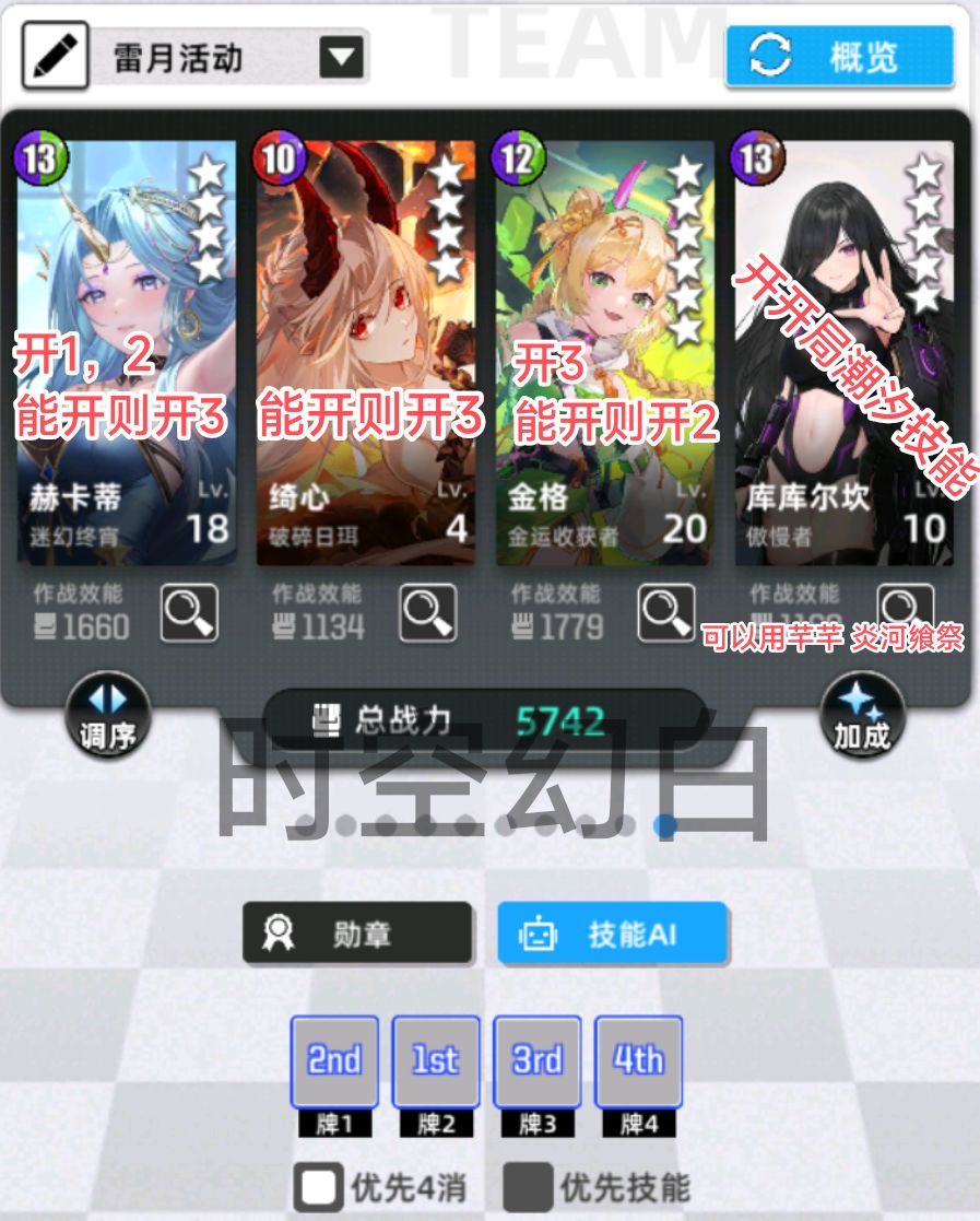 这个一号位的等级和技能开一下,还有金格的开局爆破或者也可以用伊欧的开局加能量也行,加上开局雷潮汐,可以较为稳定的循环了