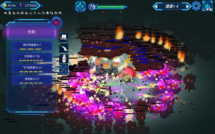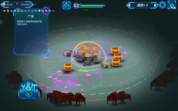 可以看到,我只是刚开了第四个武器,所有升级都是地面完成的。超低科技,一次六万多钻石。86关被流星雨砸死了(没升级基地血量)