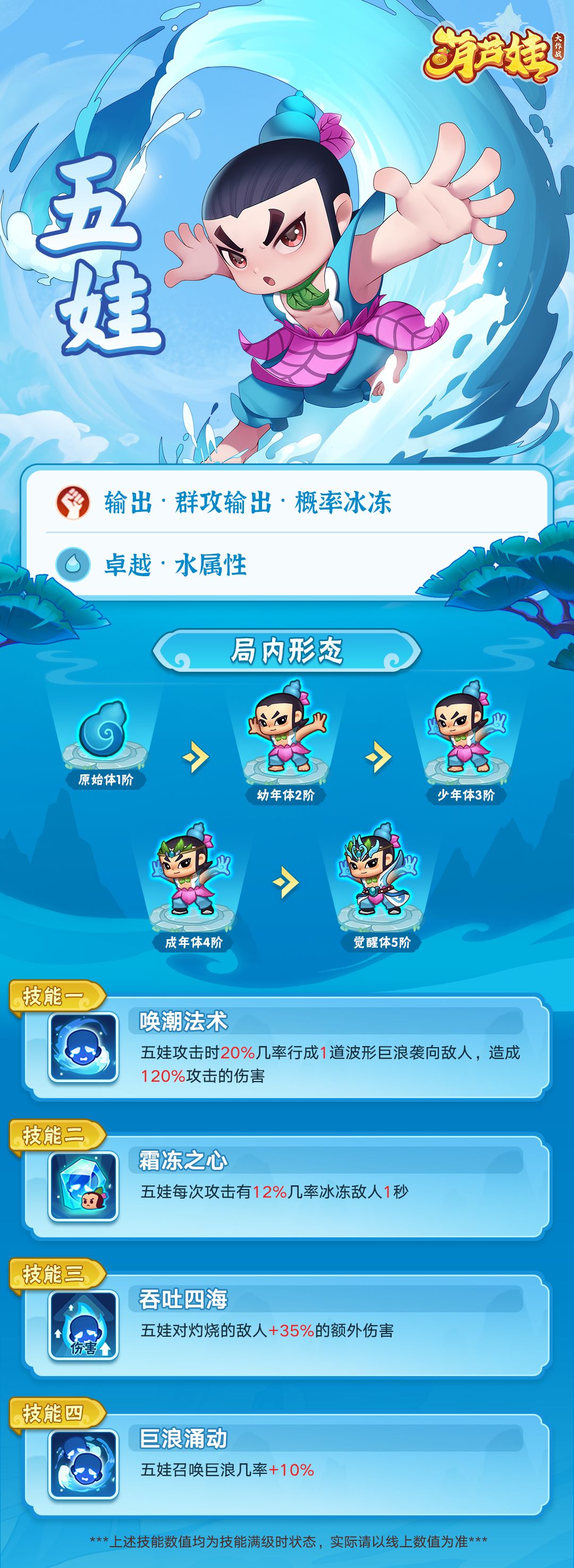 《葫芦娃大作战》中,五娃是一个拥有群攻冰冻特性的输出英雄,他召唤巨浪将敌人淹没,并将其冰冻,还能协助兄弟打出更高的伤害。