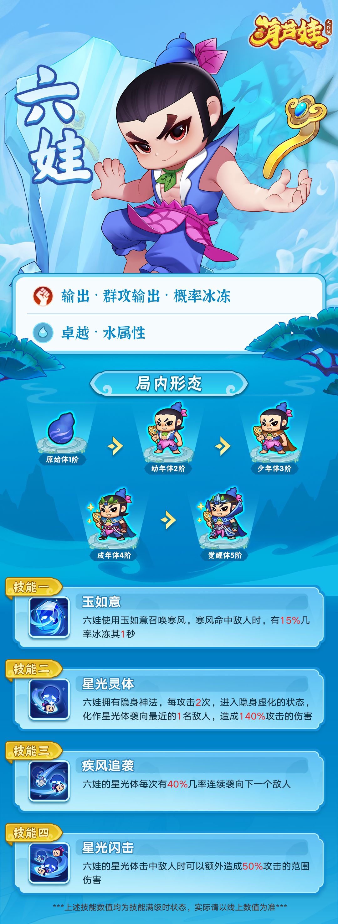 《葫芦娃大作战》中,六娃是定位为输出的群攻冰冻英雄,他隐匿起来之后,能够在暗中给予妖怪致命一击,并发动追击,是非常优秀的刺客型葫芦娃哦~