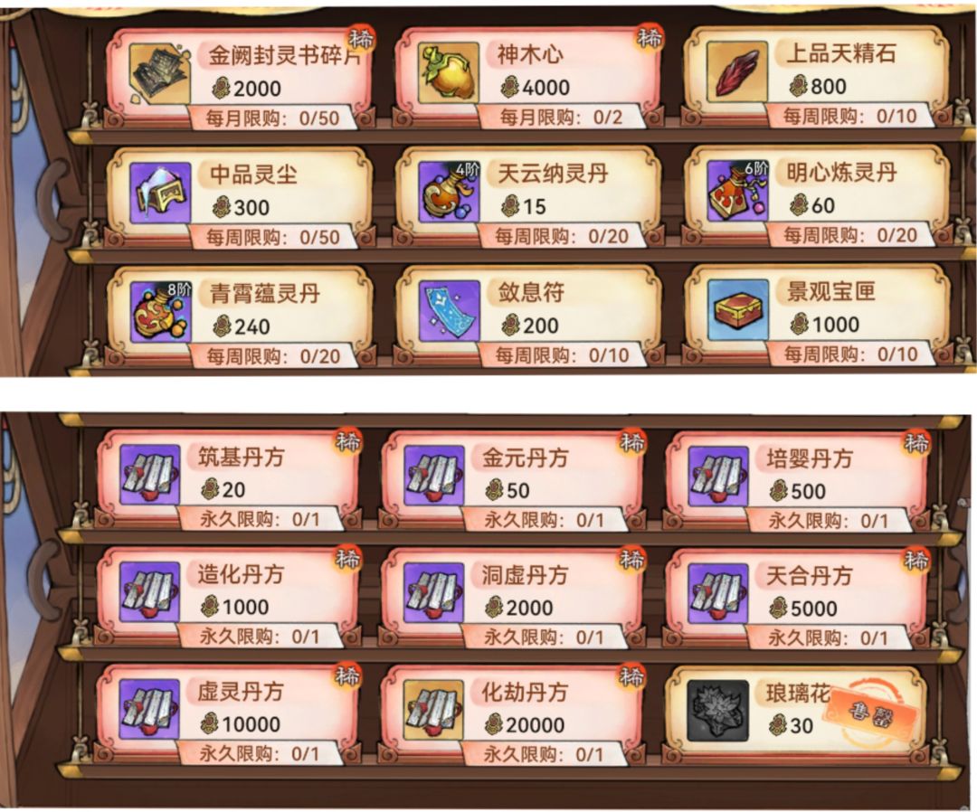 萌新每周限建议购买丹药,琅璃花,其它看个人需要。