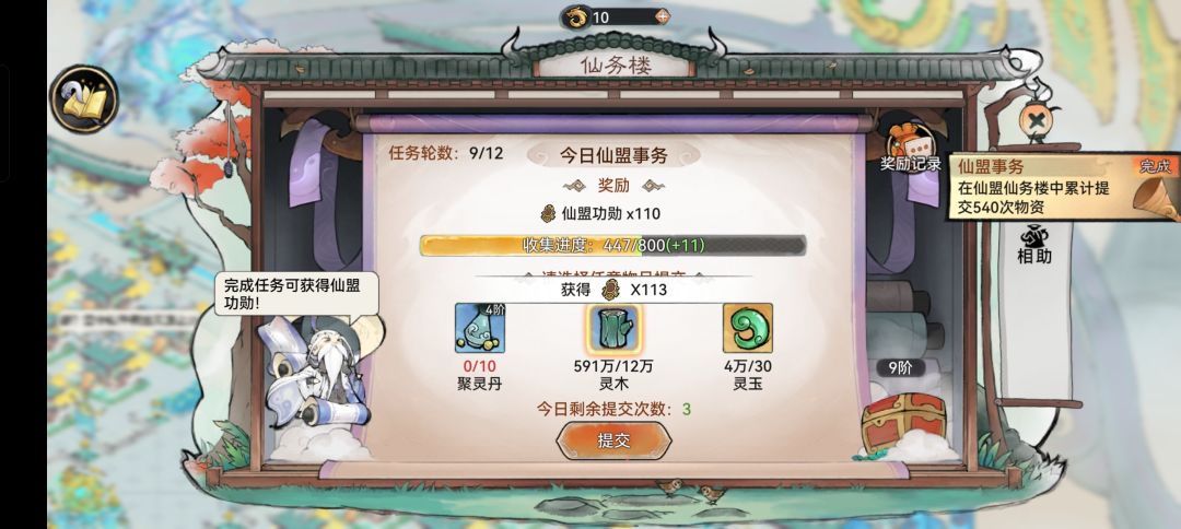 1.仙盟事务:每日可提交5次,提交物品获得功动数量从左到右分别为:60 110 300,个人建议兑换110功勋