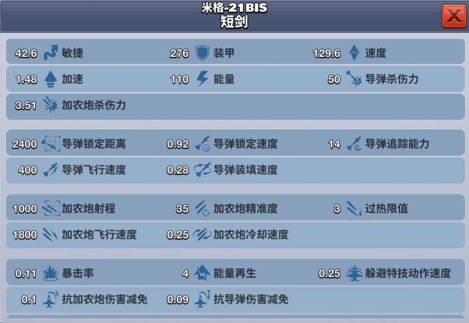 该架飞机属于C级攻击型飞机,在同级别飞机中,其电子干扰能力最强,加农炮杀伤力有一定的优势。5级解锁,在商店中推送购买,需花费32000金币。