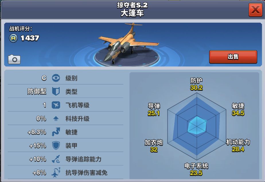 该架飞机800勋章解锁,只需680钻石即可获得。掠夺者S.2大篷车作为一款防御型飞机,拥有同级别飞机中最厚实的装甲,良好的导弹追踪性能,十分抗揍。非常适合新手玩家前期攻打地图小关卡。