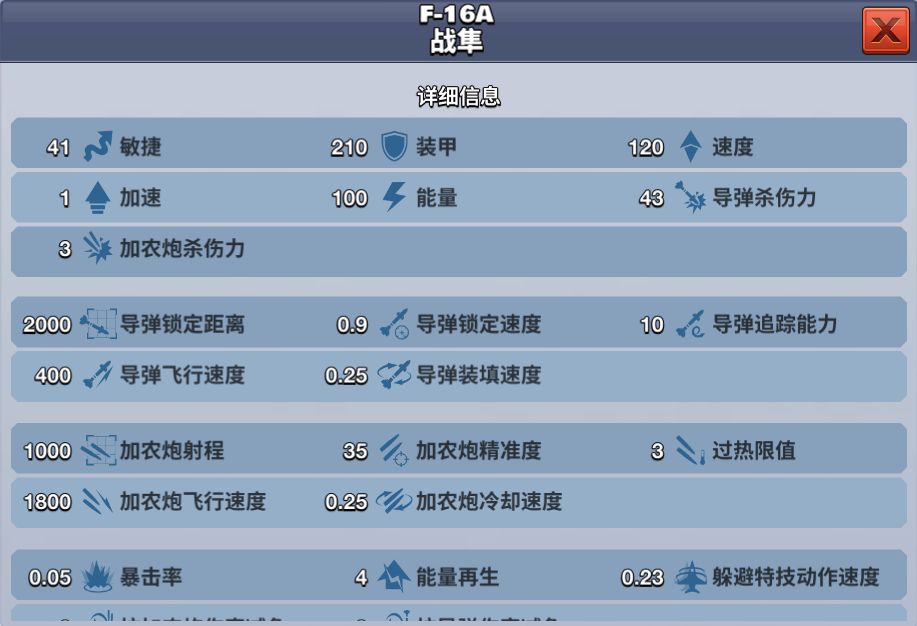 该架飞机锁定锁定快,导弹杀伤力强,属于B级攻击型飞机,是一款导弹流飞机。解锁等级为15级,花费600钻石购买获得,提前购买需要花费900钻石。