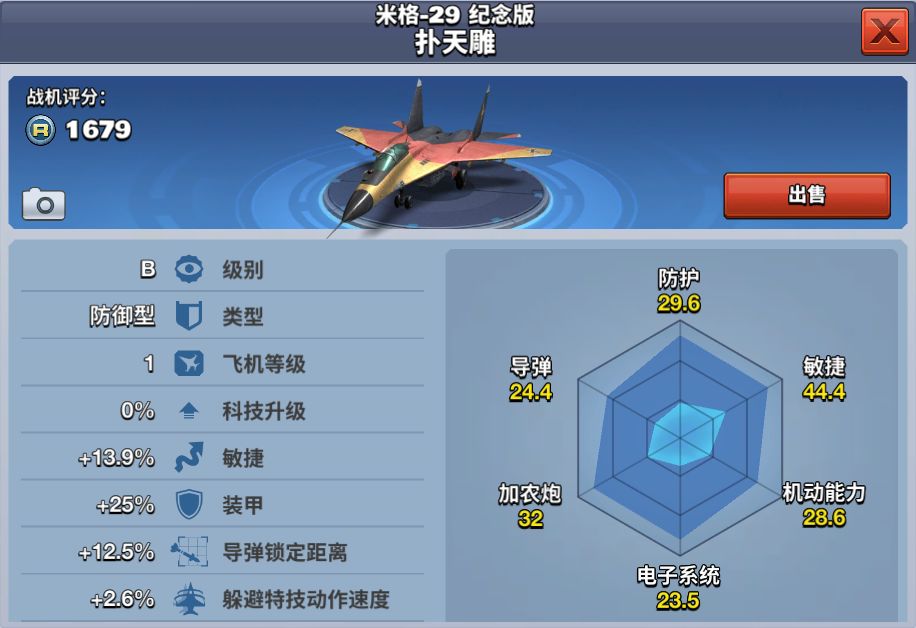 该架飞机涂装富有特色,红色的机身配上黄色的机翼再加上灰色的尾翼,给人眼前一亮的感觉。在同级别飞机中,其装甲、锁定距离和躲避特技动作速度属性均是最好的,它适应于大地图各个模式,是一款B级防御型飞机,当勋章达到700时解锁该飞机,价格为680钻石。