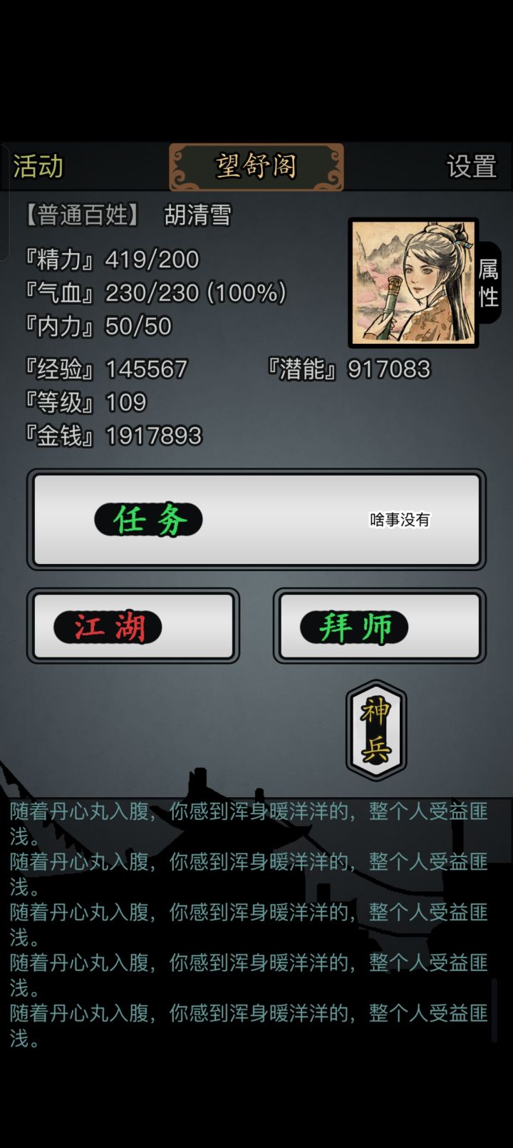 听了大佬门建议,选择了昆仑派耍剑,开局一百级帅的亚批,不过终于明白大佬非得让我存丹心丸顺带存几个送信刷飞贼给的宝箱是为了啥了。经验真的不好弄