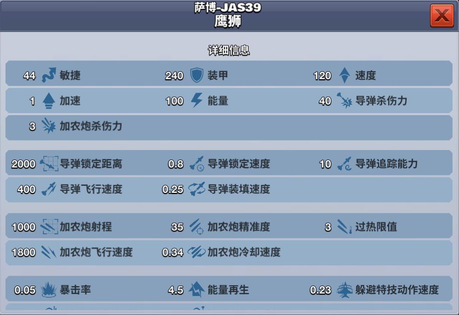 鹰狮战机20级解锁,需要花费880钻石获得,也可通过消耗1320钻石提前购买。在战斗中,其能量恢复速度和加农炮冷却速度都快,敏捷性能极好,适合1V1近距离格斗,是一款A级敏捷型飞机。