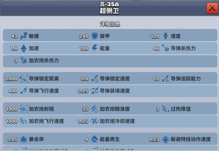 玩家等级达到800勋章即可解锁该架飞机,只需花费320钻石可以获得,也可消耗480钻石提前购买。苏-35A超侧卫能够用最短的时间加速到最大的速度飞行,各方面的属性都适中,是一款S级均衡型飞机。