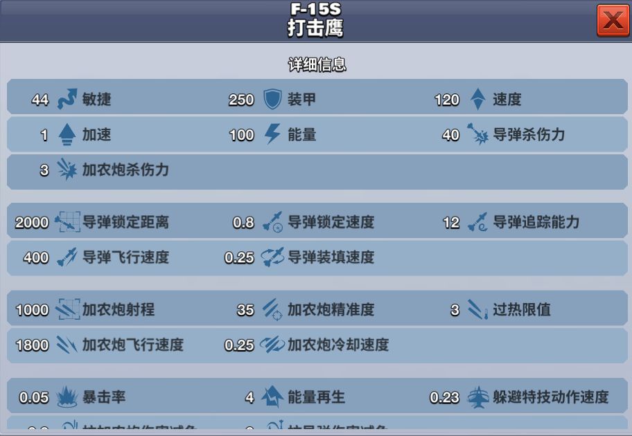 该架飞机等级达到12级解锁,需要花费920钻石获得。F-15S打击鹰的导弹追踪能力较为突出,抗加农炮伤害减免属性良好,是一款S级攻击型飞机,在玩家游戏群体中被称为“蓝鹰”,与F-15SE沉默鹰别称“红鹰”相呼应。