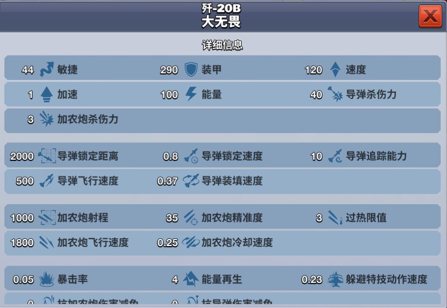 玩家勋章达到1200可解锁此飞机,需要花费3200钻石获得。歼-20B大无畏敏捷性十分灵活,拥有最好的导弹装填速度,是一款导弹飞行速度极快的均衡型飞机,在2V2联机对战中,是佼佼者。