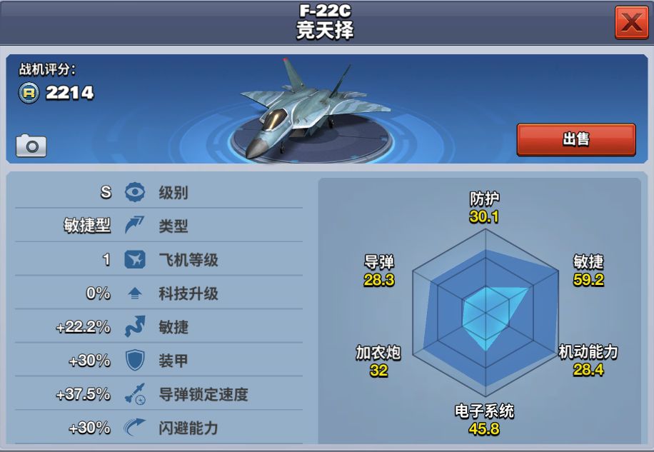 在《空战争锋》游戏中,玩家勋章达到2000可解锁此飞机,需要花费4800钻石获得。F-22C竞天择属于敏捷型飞机,锁定速度快,闪避能力强,敏捷性高,将是一款未来的1V1神器。