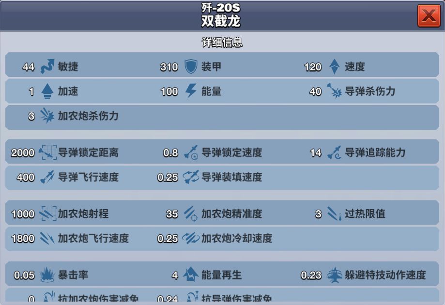 歼-20S 双截龙在游戏中是一款S级防御型战机,当等级达到34级时解锁,价格为8000钻石,歼-20S 双截龙的导弹杀伤力较弱,机炮杀伤力较强,装甲也比较厚,对机炮流选手来说是一架不错的飞机。