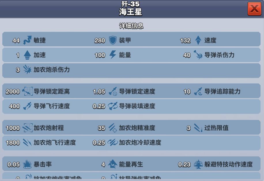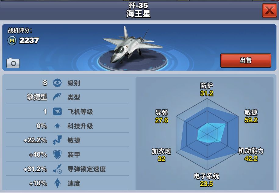 歼-35 海王星在游戏中是一架S级别的敏捷型战机,当等级达到35级时解锁,价格为8000钻石,歼-35 海王星的装甲虽然比较弱,但是它的敏捷和机动能力在S级战机中是数一数二的,可以通过机动和操作来规避伤害,加上不错的导弹杀伤力,使得它犹如一只战场的幽灵。