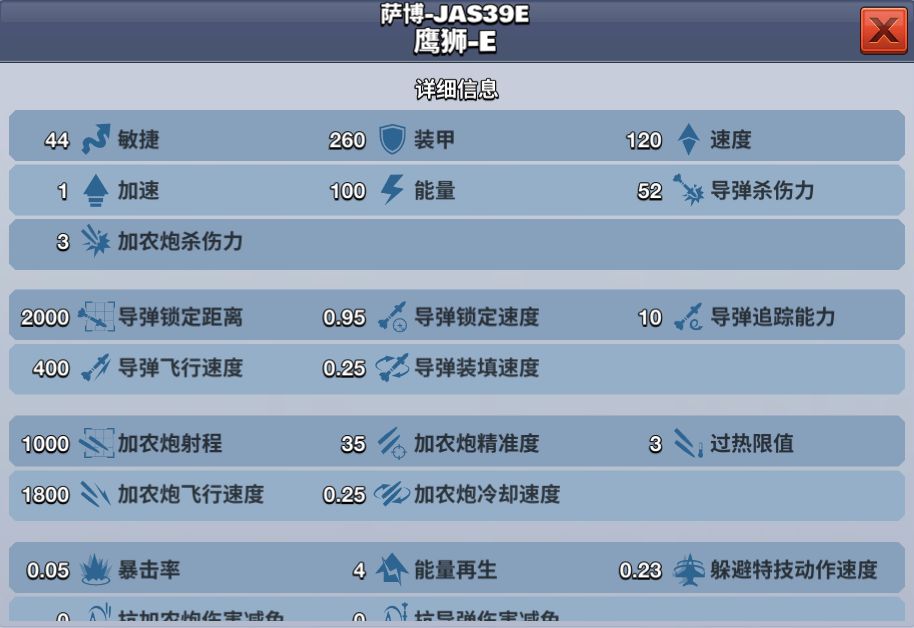 萨博-JAS39E鹰狮-E在游戏中是一架S级的敏捷型战机,当勋章达到2500时解锁,价格为500000金币