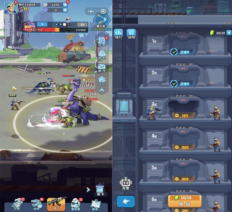 《疯狂恐龙》的主要玩法是自由配队伙伴进行PVE推图、爬塔、PVP竞技等以获取各种资源来培养玩家获得的恐龙、人物和武器等卡牌。同时,挂机也会有资源收获。