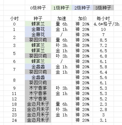 拓展1:因为游戏出现过吞茶叶,进不去花园等bug,如果怕金藤花紧缺,蜜罗柑+卟吟加速粉(减少3h)+微元素补充瓶(加20%)可作为补充少量囤下 ,蜜罗柑加20%售价126充榜等同金藤花,利润少。