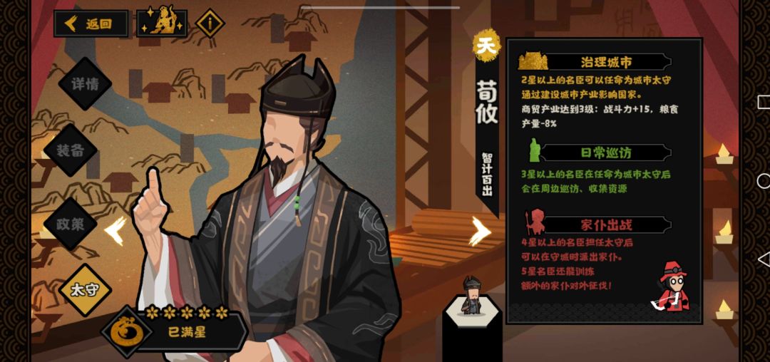非常出色的太守效果,并且对于负面效果可以采用出征后撤销太守来规避(如果非常在意降低产量的话),懒人可以和我一样大部分情况下直接挂着就行。