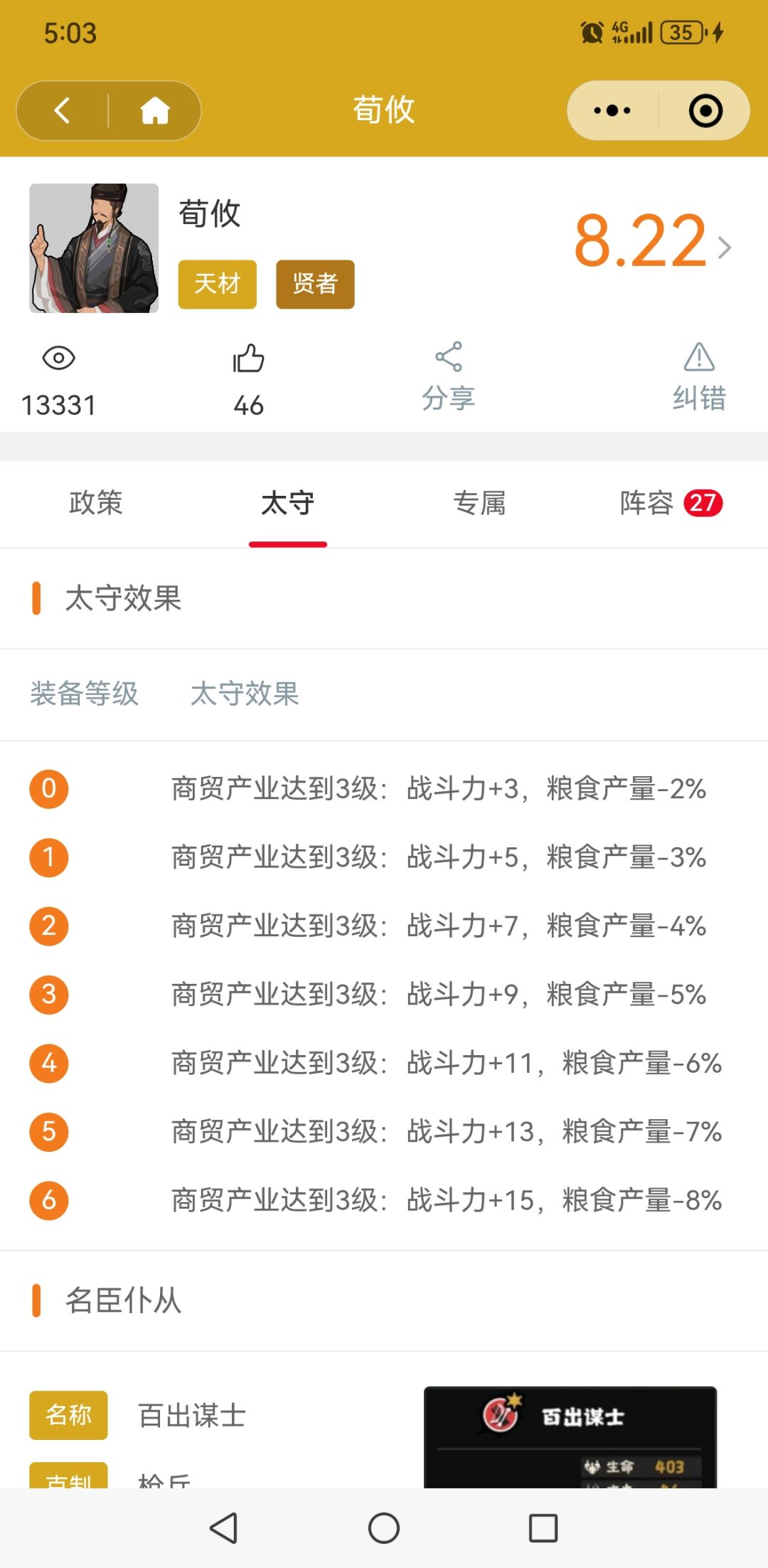 顺带一提,现在【无悔营地】更新了名臣的所有相关信息,也包含太守等级效果哟,所以也欢迎使用微信小程序【无悔营地】来进行查询~