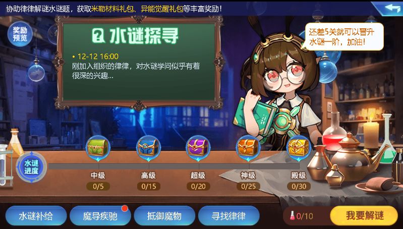 收集水谜溶剂,协助律律解开水谜题,赢取异能觉醒礼包、米勒材料礼包、云峦连珠卡、精淬之锤、正义光辉、粉钻星芒等丰厚道具奖励!