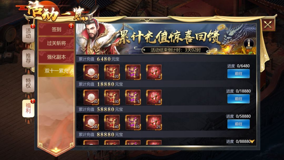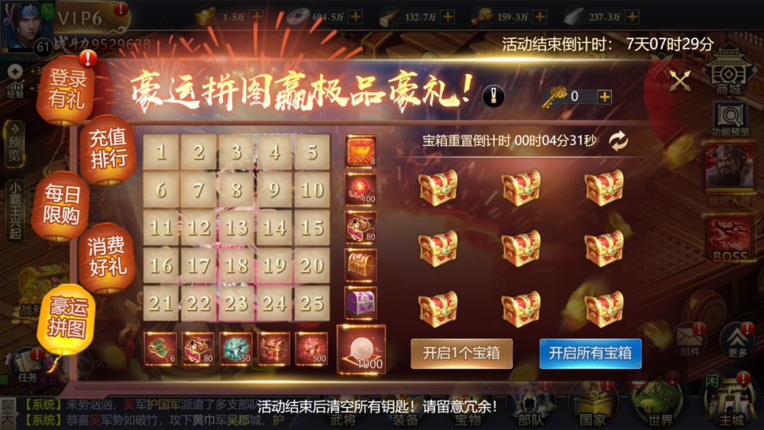 5. 豪运拼图:参与完成拼图任务即可获得大量好礼,更有宝珠、绝世魂石、玉魂、180资质将魂、绝世品质宝物!6. 累计充值:双11累充返厂,游戏内任意充值均可计入累计;完成累充任务领宝珠、国令将魂礼盒、国令技能礼盒、绝世魂石!