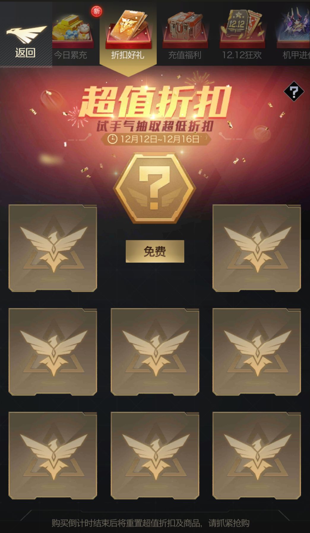 活动开启期间,玩家可以在折扣好礼商城抽取超值折扣并购买稀有道具。不同折扣对应不同种类的8种商品。折扣商品限时出售,且每种商品限购1次,重置倒计时结束将重置折扣好礼商城,所有商品将会消失,需要重新抽取折扣。每天会有1次免费抽取折扣,和10次金币抽取折扣的机会,每次金币抽取折扣会消耗25金币。每天0点重置免费抽取和金币抽取折扣的次数。