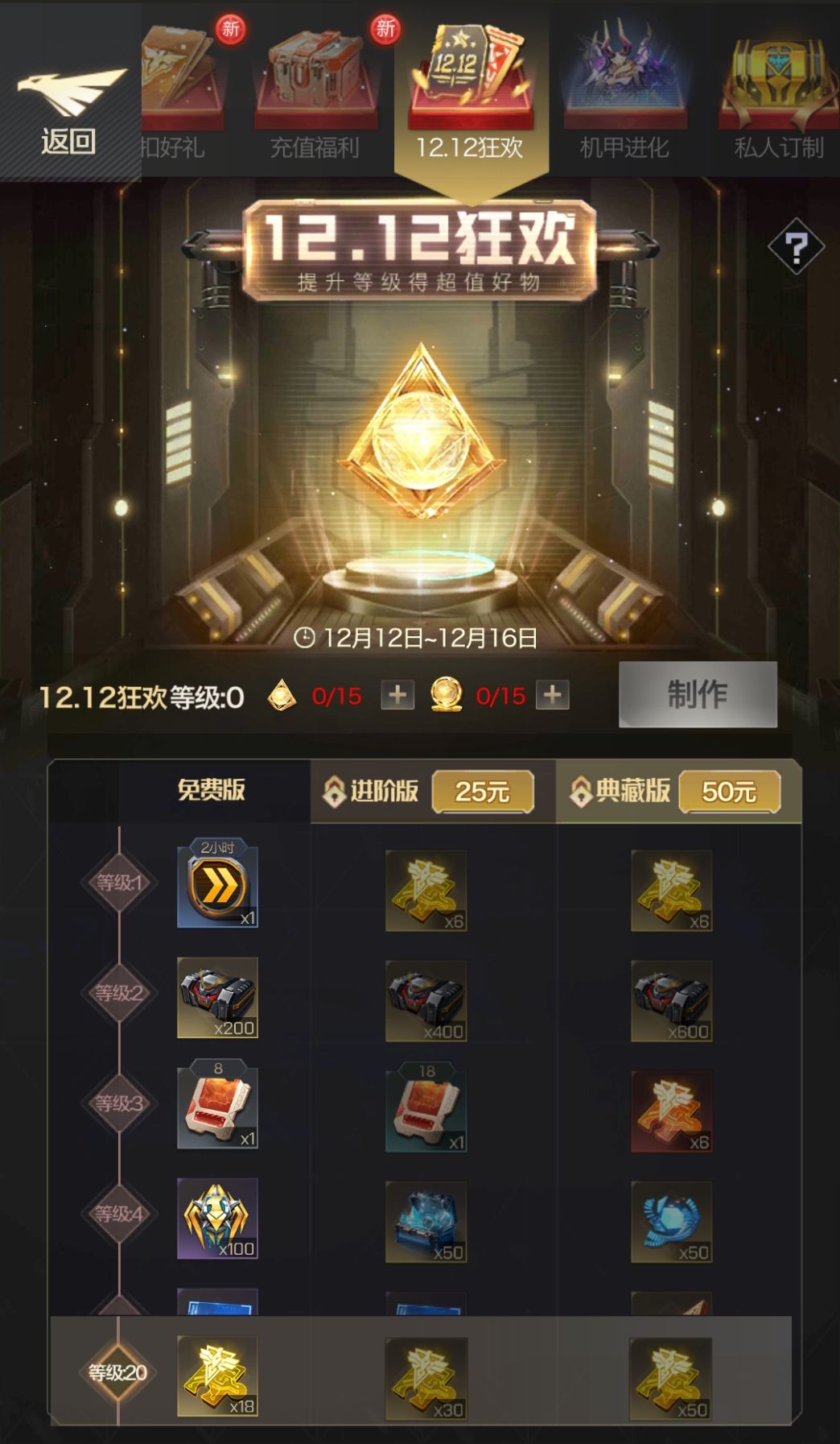 双十二狂欢活动期间可通过击杀野怪、采集和联盟捐献获得购物狂欢的材料,消耗相应数量的材料可提升购物狂欢的等级,等级提升后可获得对应等级的奖励,奖励分为免费奖励、进阶奖励和典藏奖励,进阶奖励和典藏奖励更为丰厚。
