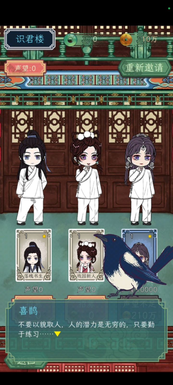 【3】第一出演出的戏角安排,与开局招募演员有冲突。开局只能招募一男一女,但第一出便是 “文老生” 和 “文丑” 同台。古往今来较少有女性成功反串此类男角。