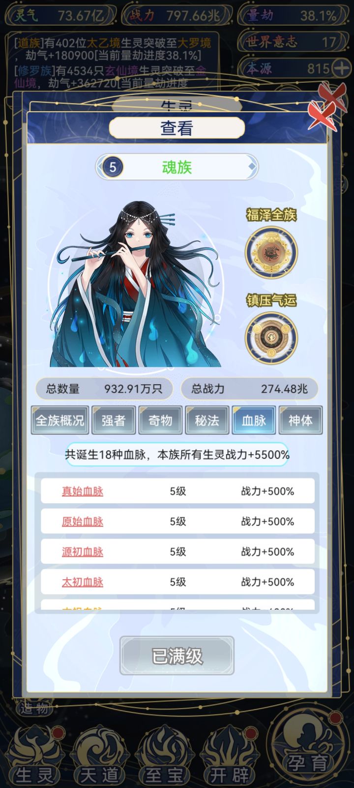血脉:上限18种,每种5层,就是你要刷90次,可以在主宰里的天道空间,诸神之战中刷,满增幅5500%