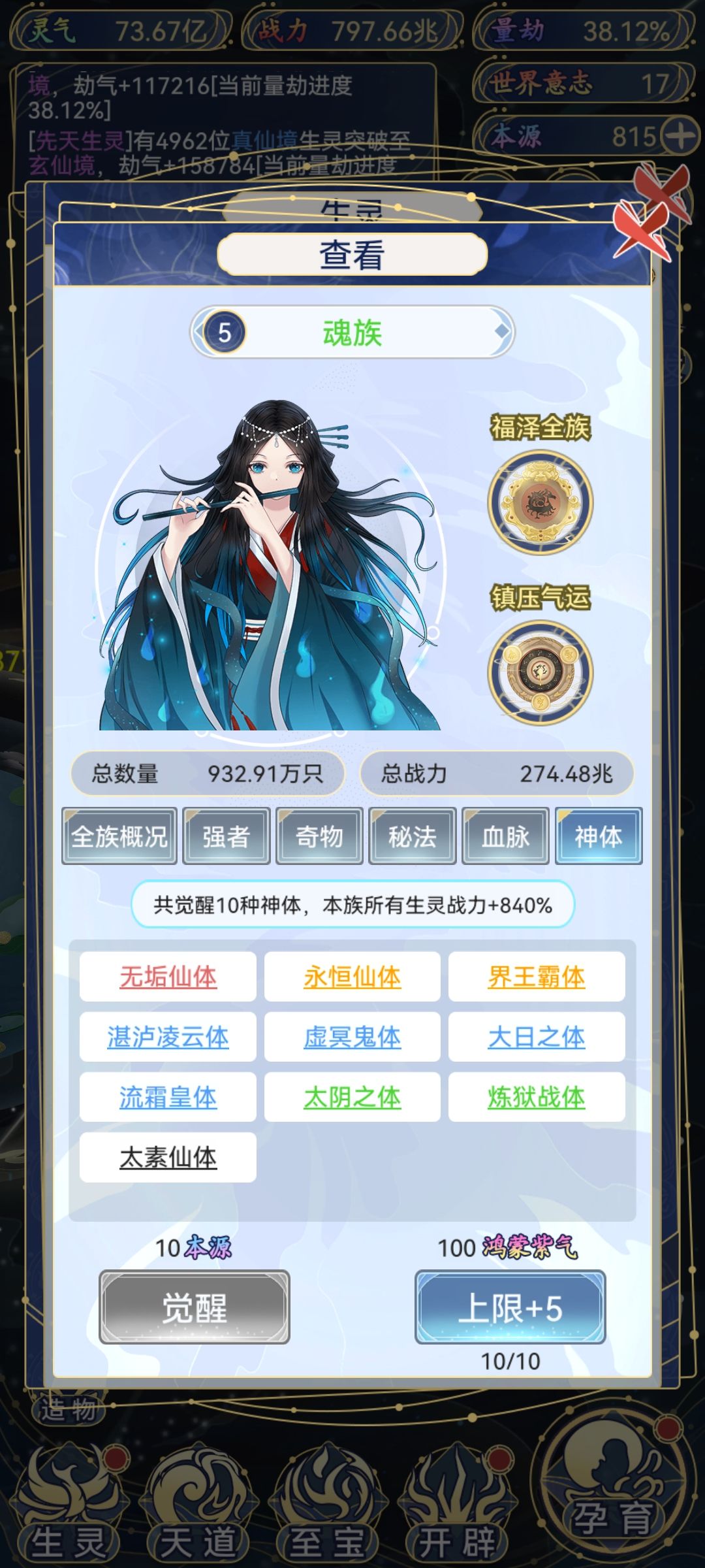 神体:初始上限10种,可以通过鸿蒙紫气增加上限,具体极限本人尚未测试,点满10层,增幅800%上下,欧皇与非酋的竞争舞台