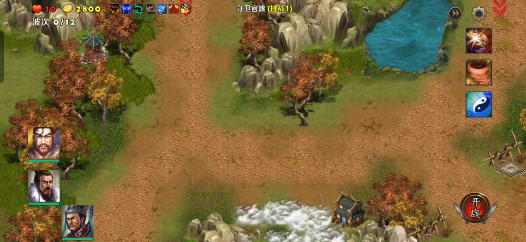 打法思路:战斗开始之前荀彧贾诩去守右边出兵口,许褚守左边,然后全部建造连弩箭塔然后开始战斗,中后期有金币就把所有可以建造的都建造了,注意第二、五、八以及最后一波会有投石车,投石车一出现英雄上去莽,第七波会有红色步兵出来就上去杀。第九波最后一波会出boss。