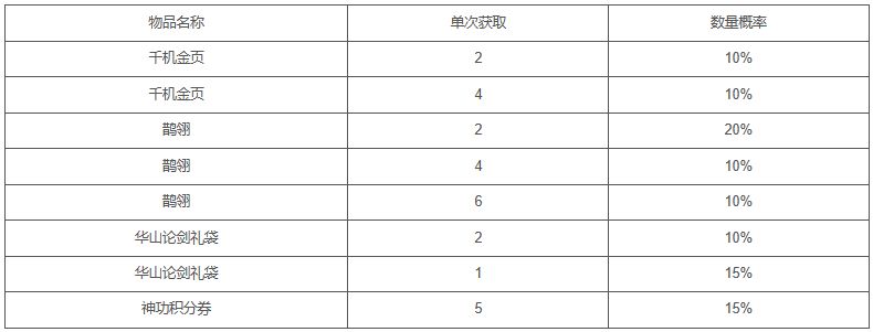 2、可抽取:千机金页、鹊翎、华山论剑礼袋、神功积分券等超值大奖,100%中奖率!