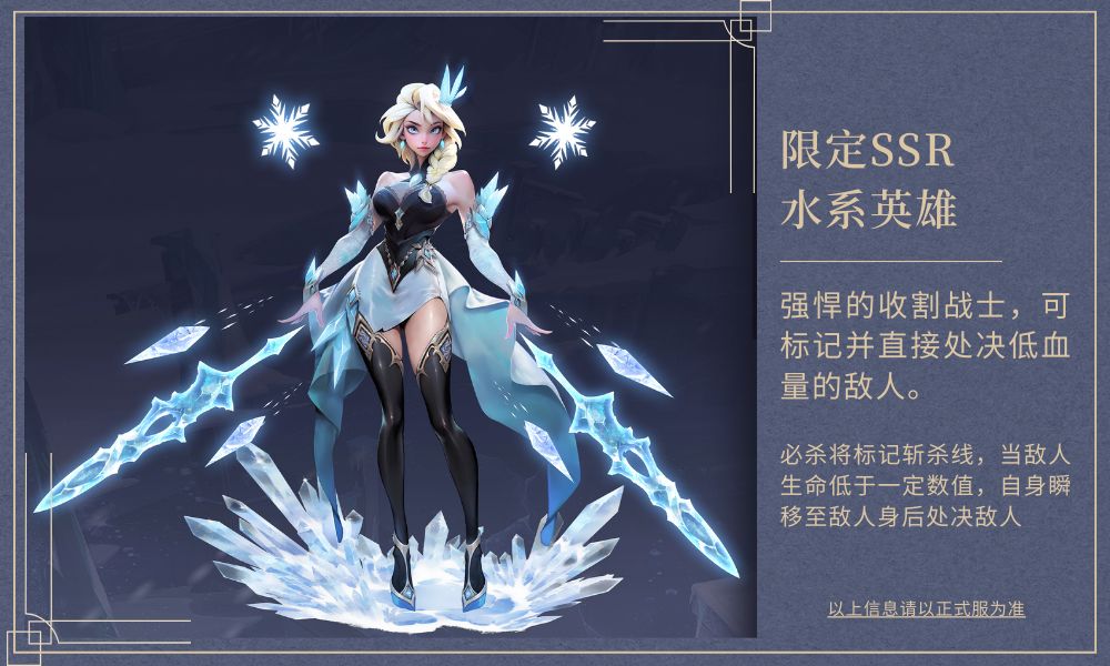 - 全新限定SSR水系英雄即将登陆活动,汹涌猛烈的冬风中,女神驾驭冰雪,在山林中狩猎奔走,白雪中那一抹神秘的身影,她的真实身份究竟是谁呢……