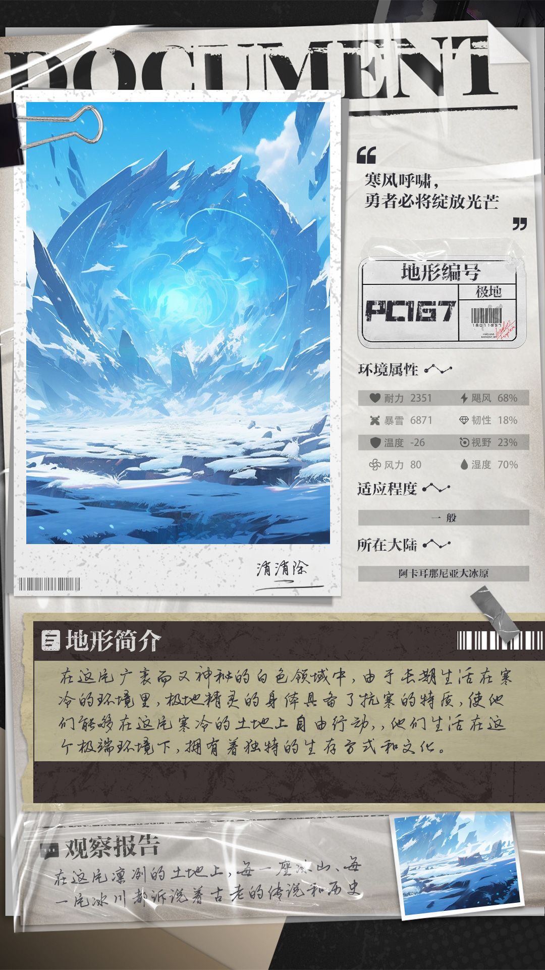 在这片广袤而又神秘的白色领域中,由于长期生活在寒冷的环境里,极地精灵的身体具备了抗寒的特质,使他们能够在这片寒冷的土地上自由行动,,他们生活在这个极端环境下,拥有着独特的生存方式和文化。