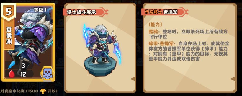 夏侯渊的能力【黯鸦】:登场时,立刻杀死场上所有敌方飞行单位,能出场直接秒杀张郃。这位传说将士通常是作为针对环境另一大热门飞行单位:甘宁的杀手锏较多登场,作为针对张郃也是非常好的一个选择。