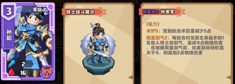 孙韶的能力【双重剑气】:每回合对当前生命值最高的一名敌方将士释放剑气,造成3点物理伤害,在施展双重剑气后,如果目标待机值大于4,则追加1点物理伤害。尽管无法直接完封或击杀张郃,但是这个定点狙击的目标能稳定压制血量最高且还未孵化的张郃,使得在后排的张郃未出击就提前去世。