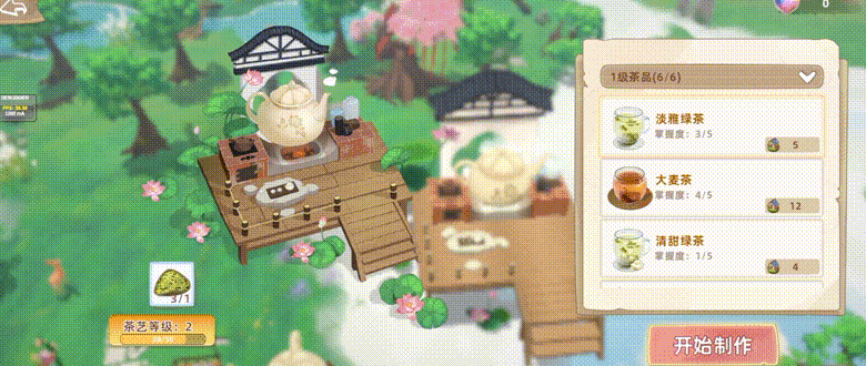 茶艺共分十个等级,茶艺等级越高,在「茗舍」可制作的茶式越多,配备足量材料是制茶第一步,掌握合适火候也是至关重要的一步骤,指针在红色区域停下可获得双份好茶。