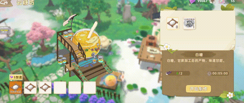 现在,田地从之前只可播撒种子优化到可种植作物,再也不用盼星星盼月亮地等待4h的云草成长了。作物生长时间为5min-30min,达到一定人物等级即可解锁不同种类作物种植,共有「茶树」「麦苗」「甘蔗苗」等八大作物棵种植(可用于后续加工)。