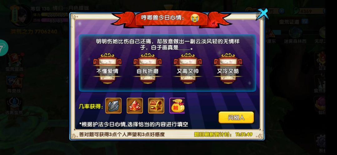 找到门派护法还可以回答一次问题,也可以获得3点好感度3点个人声望,还有几率掉落基石、仙石、坐骑碎片箱子,坐骑口粮、普通信物、贵重信物、珍藏信物。看护法的心情回答相应问题。护法发怒,选择第一个答案;护法哭泣,选择第二个答案;护法笑脸,选择第三个答案;护法色眼,选择第四个答案。