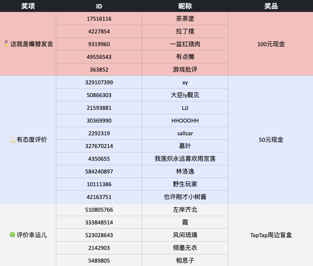请获得实物奖品的朋友在开奖后 1 周内前往 个人主页 填写收货地址与联系方式,获得现金奖励的朋友请及时填写信息收集问卷(问卷将通过「TapTap 社区」站内通知发放),逾期将视为自动放弃获奖资格。