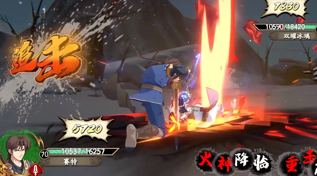 然后赛特在PV中使用了一次【无方飞剑】,接着就来了个“追击”,这真是延续了火系的一贯传统啊!砍王有,安天帝有,接着的赛神你居然也有,这点维一猜测是在赛特天赋中的自带效果,因为这个效果的名字叫【重击·崩山】,应该和之前李靖、妮可天赋中的【重击·神威】与【重击·散魂】一样是个概率触发的效果,气血越高则追击的概率越大吧。