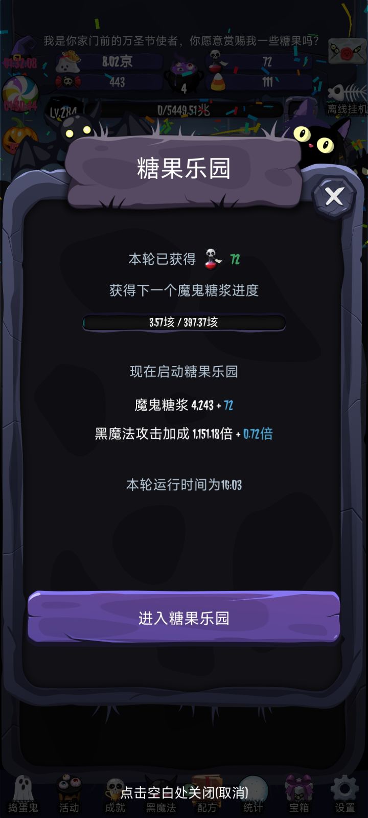 说完获取资源那就要谈到资源利用,主要还是糖果乐园,一转啥也别管把价格最低的那几个先点了,二转一定要解锁派对,我的加点原则就是从便宜的买起尽量每次转生不剩点数,三转如果到了我这个程度那就是四位数的买就完了,刚过万的随便买,几万的看着来,反正少剩点数。