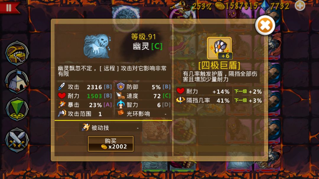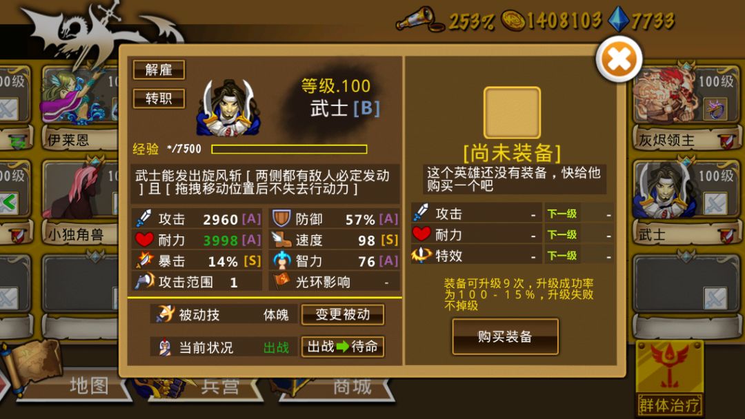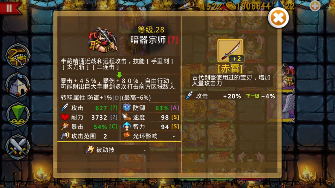 服部半藏攻击前方三格敌人或者发射手里剑,手里剑有几率攻击两次,一转的巨大手里剑攻击前发3X3敌人攻击三次,并有几率发射两个大手里剑。