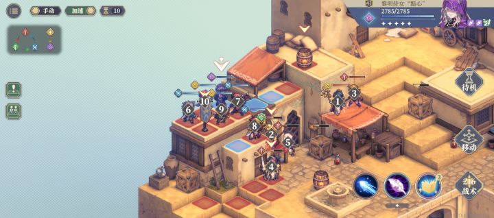 开局暗心到图一位置把楼下晶尘包打破,不然兵蜂会被对方弩手秒!!!然后利刃,兵蜂,斥候上楼,利刃如图堵门开二次闪避技能!!剩下先干掉魔禁,然后慢慢打就可以了~