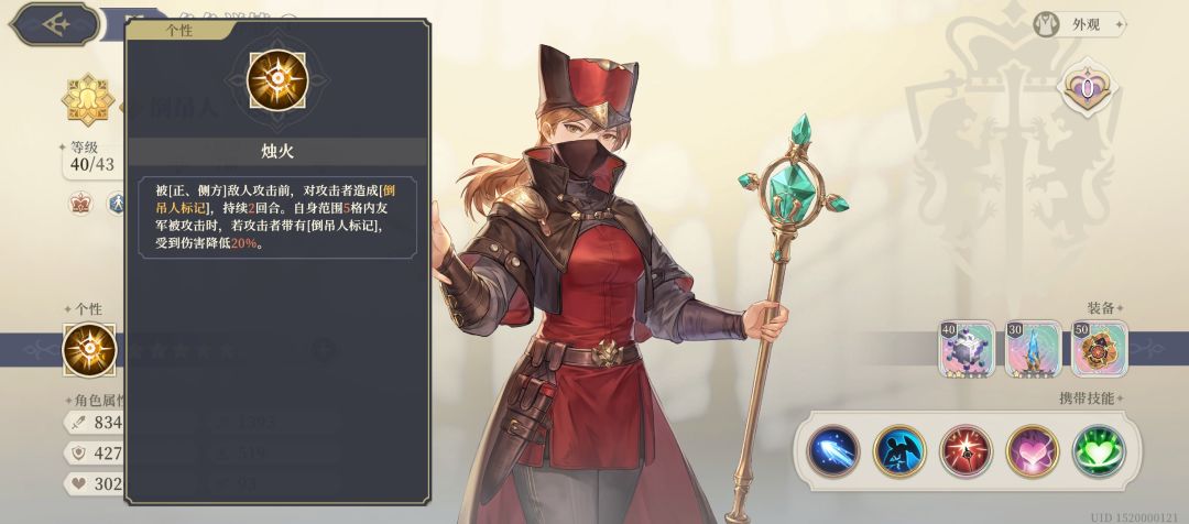 我过这图时,最难点在于第一次旗子插出来前这一段时间,运气不好后边几个远程会被对面惩戒萨曼莎秒,如果重新打这关,我会给上边几个带高魔防高血的隐者塔罗,毕竟都是用生命百分比的技能在打,回合数内输出没有什么压力的,带隐者是可以的!还有我如果让兵蜂站位到惩戒萨曼莎附近(我方炸药桶旁边)行动结束要是能给CJ萨曼莎挂上倒吊人Dbuff那压根就没压力了,因为烛火的特性(图5)全员减伤20%,兵蜂和烛火的组合本来是想推神兵时候尝试的,结果这里用上了…