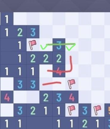 也是从下向上看,第一条红线1雷,第二条红线2雷,根据第二条红线和“2”,得到两个绿对勾。