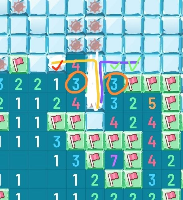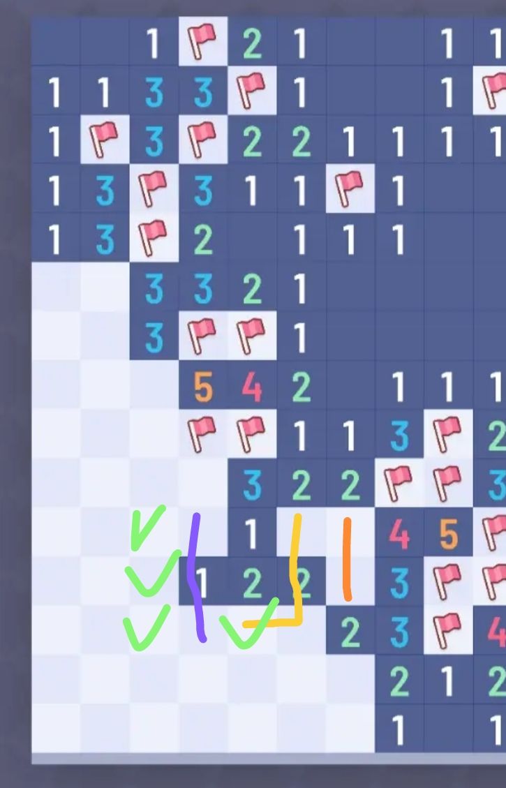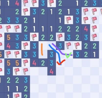 减法可以隔行,当然也可以扭曲起来,比如此图,用于判雷的是两个“4”,橙线1雷与紫线3雷做31减法,得到红绿的结论。