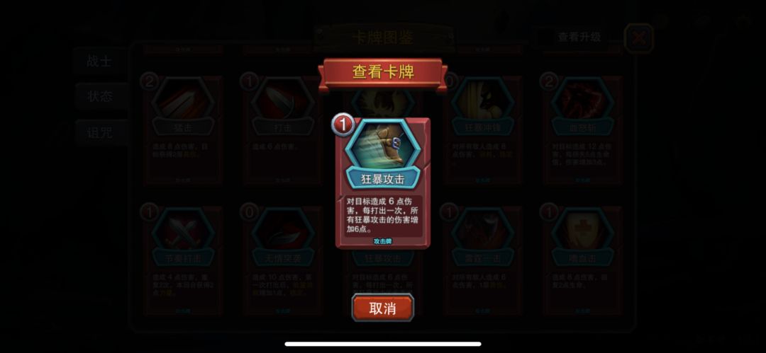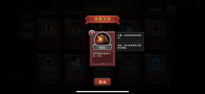 2.必选卡牌:断筋-不用说,必选卡牌,但可以不用优先升级,复制必须给这个卡;剑在人在-打攻击牌加护盾的,防止遇到三鸟之类一回合减不了员,攻击还高,能稍微减少扣血;弃防强攻-核心输出卡牌,能量花费0,配合魔文布袋一回合能过两次牌库;狂暴攻击-也是核心输出卡牌,每打出一次都会增加下一次伤害
