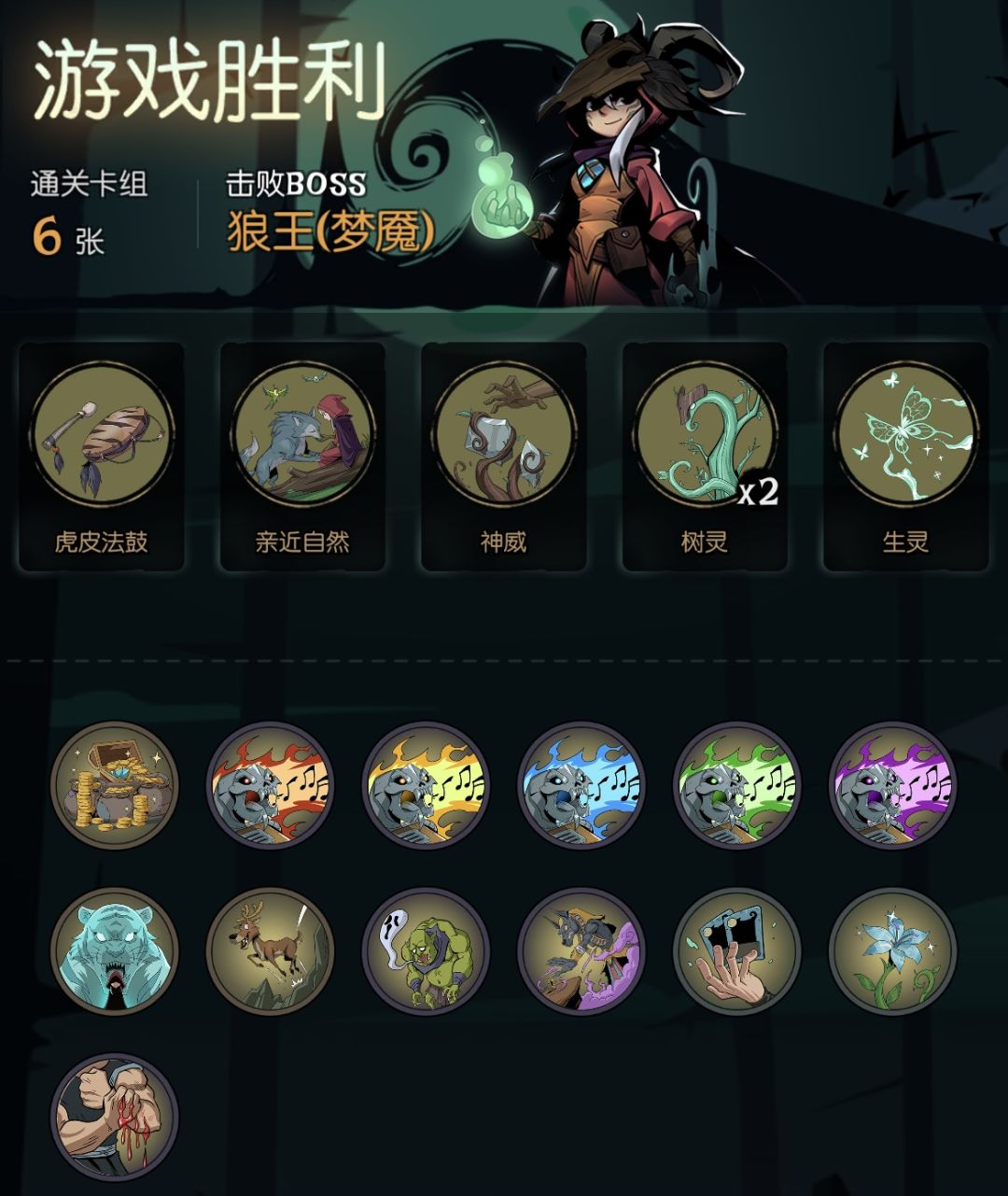 虎皮法鼓留着,生灵+两张树灵,还有两张成长卡(松鼠银行没存钱所以没钱删了,理论上还是能凹的:两张成长卡可以换拜火,然后还有不知道如果没有成长卡能不能过狼王)